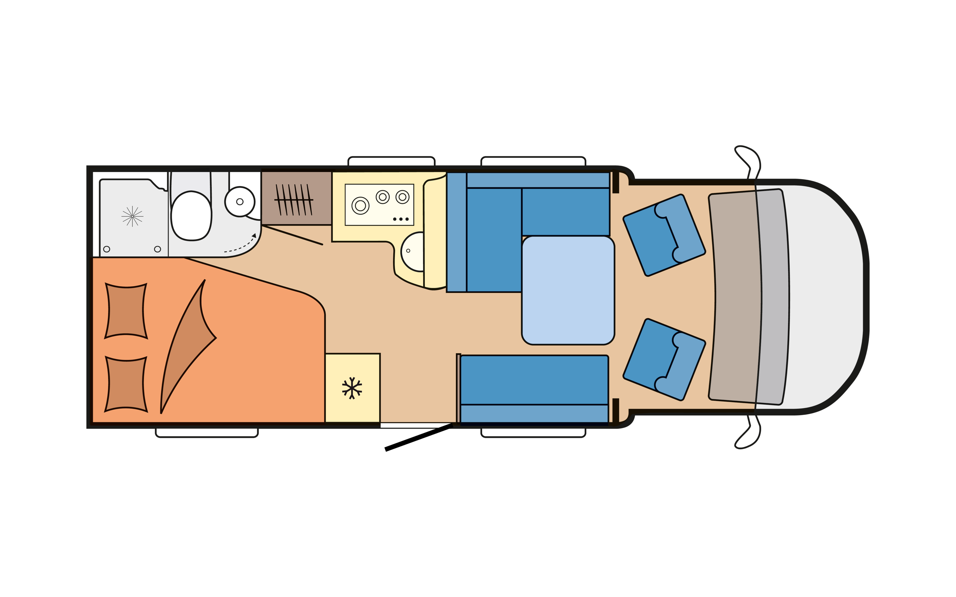 Denne model er kendt for sin kompakte størrelse, praktiske indretning og komfortable faciliteter, der gør den til et ideelt valg for par der ønsker at rejse med stil og bekvemmelighed