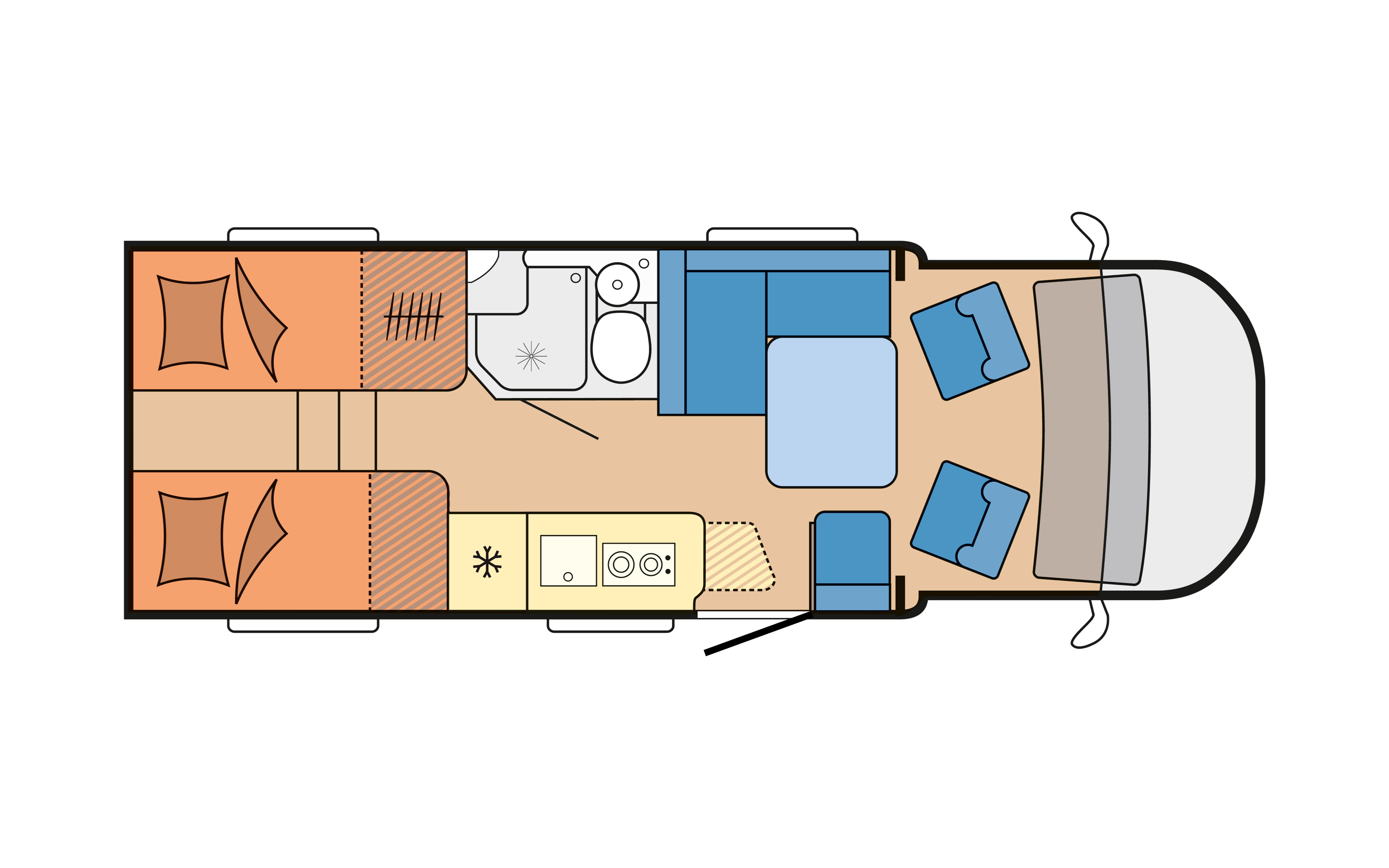 Hobby Ontour T 710 GE har et layout, der er designet til at rumme op til 2 (3) personer. Den har enkeltsenge i bagenden, der kan konverteres til en stor dobbeltseng så der er mulighed for at et mindre barn kan sove i midten.